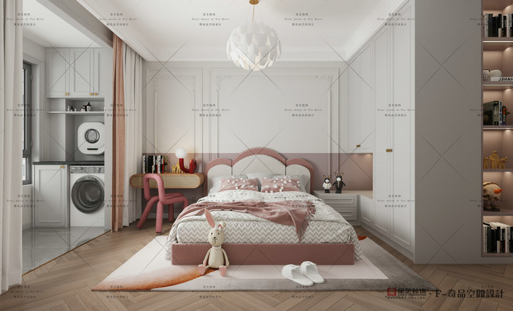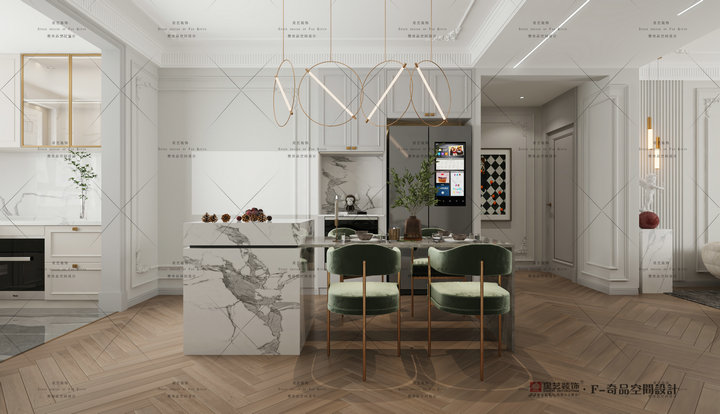 天然紋理的石材島臺,造型上與背景墻線條元素相呼應(yīng),更具視覺延伸感,為生活增添了儀式感。陳設(shè)的三兩組軟裝使空間靈動而優(yōu)雅,隨性打開的書本恰好點亮了室內(nèi)的文藝氛圍。仿佛還原了與家人聊天、品茶、閱讀的生活情境,在空間藝術(shù)韻律的熏陶下,演繹極具個性的法式輕奢風(fēng)情。