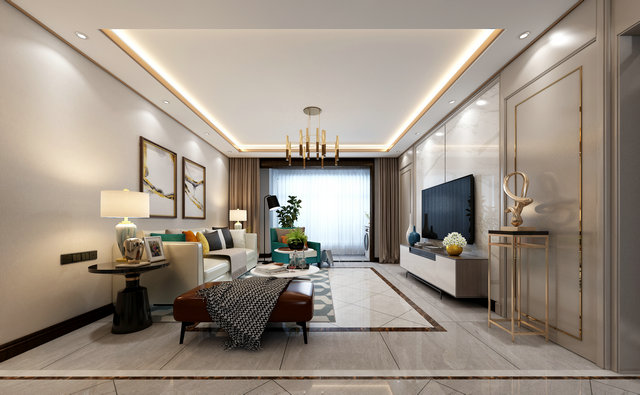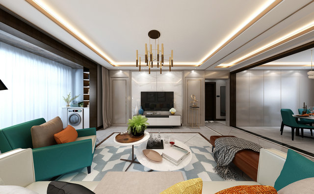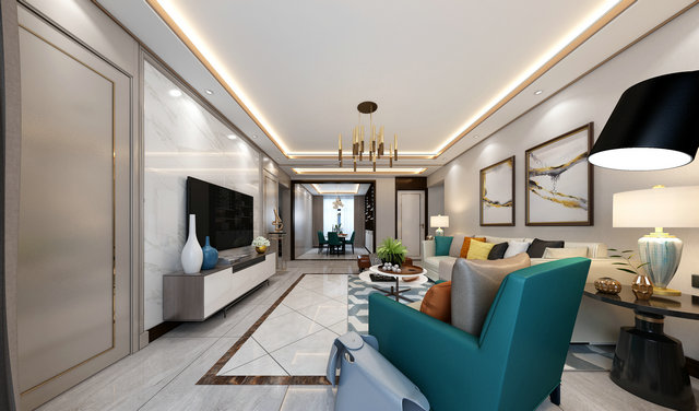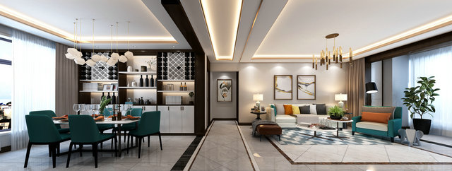 藍(lán)綠色作為空間的主題色,在空間中得到充分體現(xiàn)。600*1200灰色石材紋理地磚覆蓋整體空間,紋理本身成為裝飾的一部分。質(zhì)感輕奢的皮質(zhì)沙發(fā)是客廳的視覺中心,輕松閑適的氛圍也給人以生機勃勃的力量。