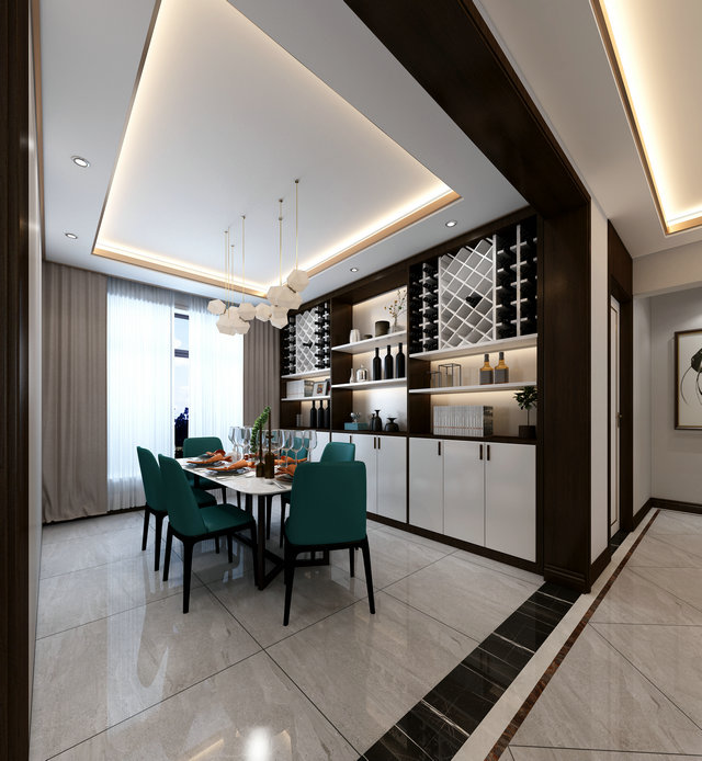 餐廳延續(xù)了客廳的藍(lán)綠基調(diào),定制設(shè)計的不銹鋼與大理石組合的餐桌、木質(zhì)布椅、套色的酒柜等,為空間增添更多趣味的元素,傳遞出主人不拘泥于常規(guī)、努力求變的生活態(tài)度。
