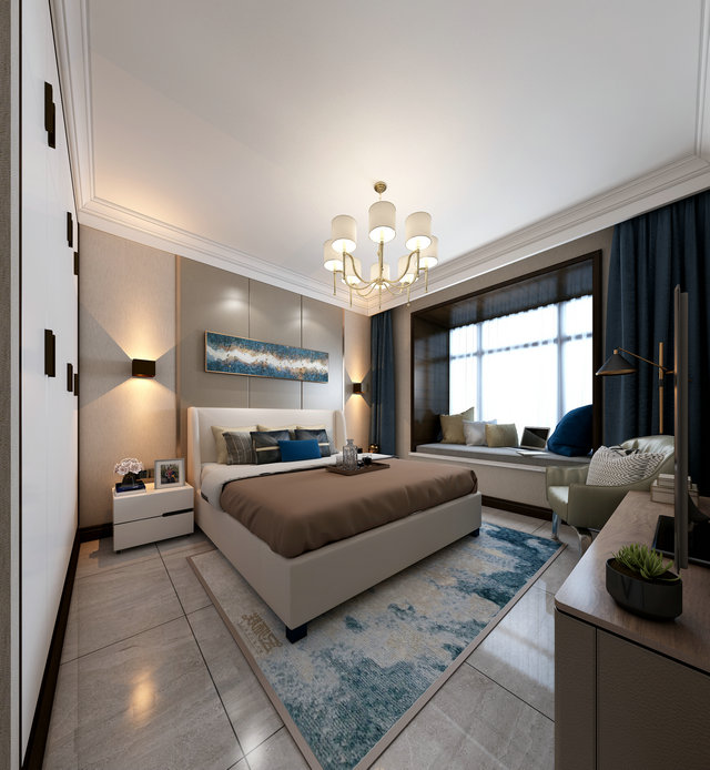 主臥室掛畫形式呈現(xiàn)在主臥的淺色硬包背景墻上,與白色的天花相得益彰,流露輕松自然的生活氣息。